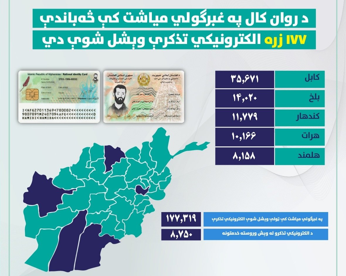 د ادارې د الکترونیکي تذکرو د خدمتونو ریاست د معلوماتو له مخې، کابل ولایت د ۳۵ زره او ۶۷۱، بلخ د ۱۴ زره او ۲۰، کندهار د ۱۱ زره او ۷۷۹، هرات د ۱۰ زره او ۱۶۶ او هلمند د ۸ زره او ۱۵۸ تذکرو په وېش سره، هغه پنځه ولایتونه دي چې په یاده موده کې یې تر ټولو زیاتې الکترونیکي تذکرې وېشلي دي.