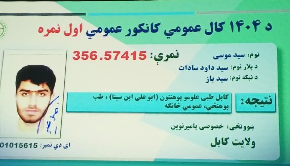 سید موسی چې له لیسې خصوصي لیسې څخه فارغ شوی د کابل د طبی پوهنتون د معالجوي طب پوهنځي ته بریالی شوی دی.